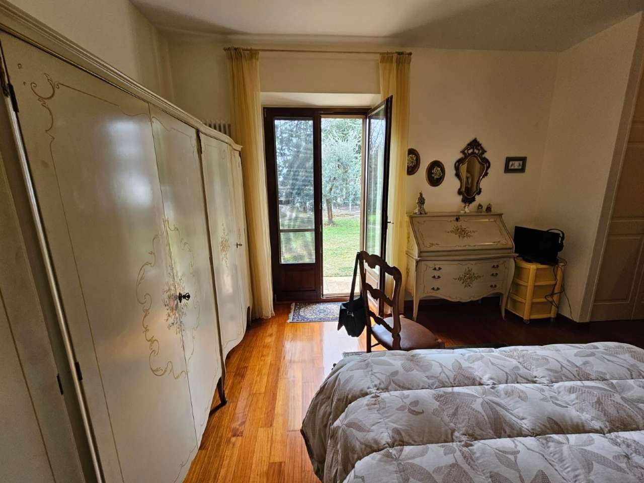 La zona notte offre una camera principale con bagno privato e accesso diretto al giardino, insieme a una camera di medie dimensioni e una camera singola.